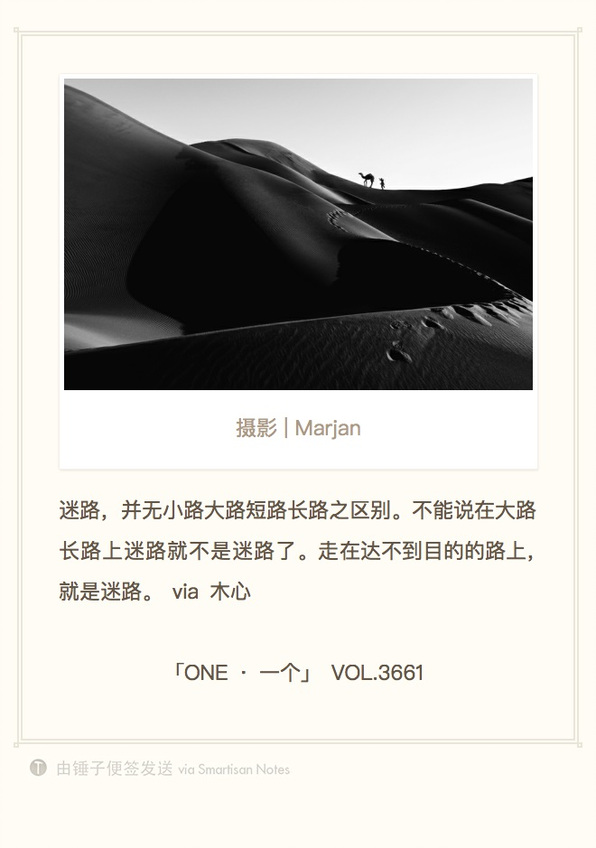 转@ONE一个 迷路,并无小路大路短路长路之区别。不能说在大路长路上迷路就不是迷路了。走在达不到目的的路上,就是迷路。 via 木心 (VOL.3661)