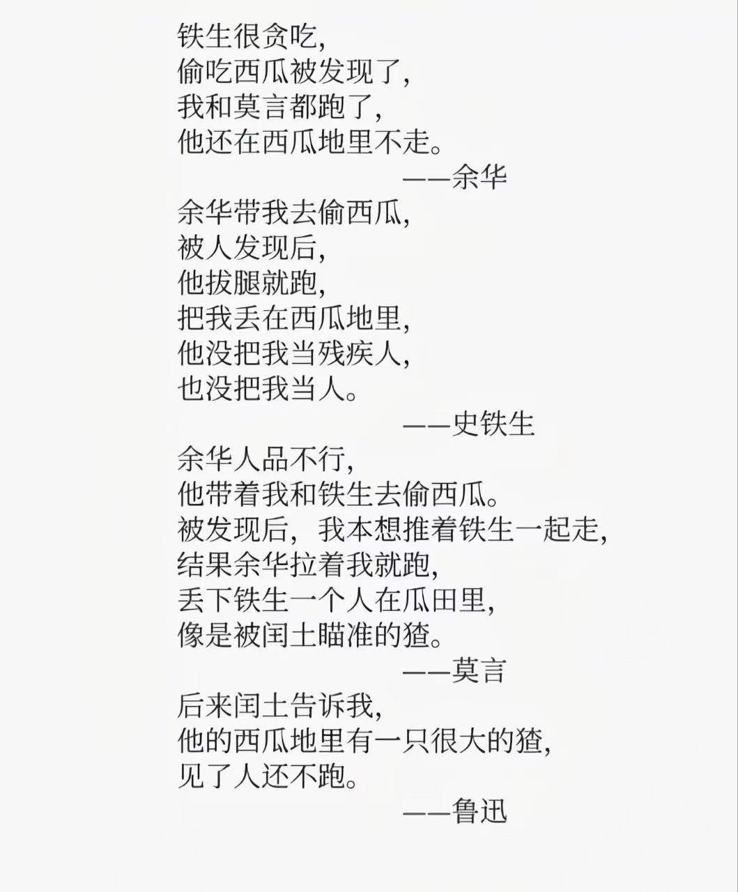 被发现后,我本想推着铁生一起走,结果余华拉着我就跑,丢下铁生一个人在瓜田里,像是被闰土瞄准的猹。